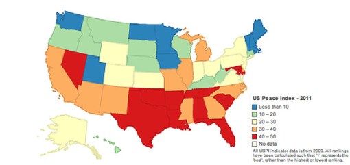 Voir Dire posts measures of state peacefulness. The New England states fair very well, with Vermont ranked #3. What is visually striking to me is the north-south divide.