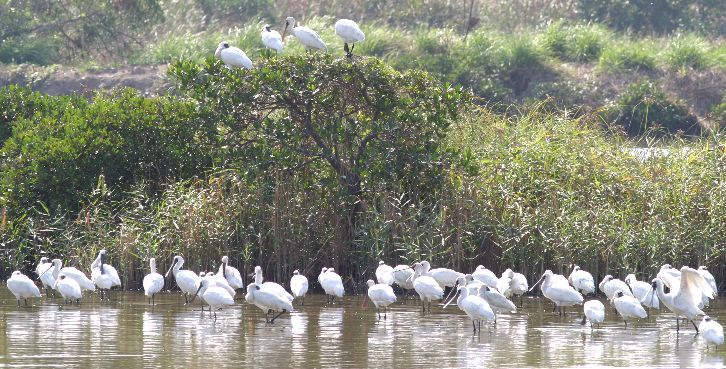 Today, due to the generosity of contacts at WWF in Hong Kong, we received a tour of Mai Po Nature Reserve in Hong Kong’s New Territories. Mai Po is a large wetland reserve filled with very cool flora and fauna, and really is a bird lovers’ paradise. Mai Po is protected by the Ramsar Convention on Wetlands, and our visit was truly a treat. We saw mangroves, traditional shrimp ponds, fish farms (right outside the reserve), and beautiful flowers, and, with fancy digital binoculars and scopes, saw beautiful birds: spoonbills, herons, egrets, and ducks.